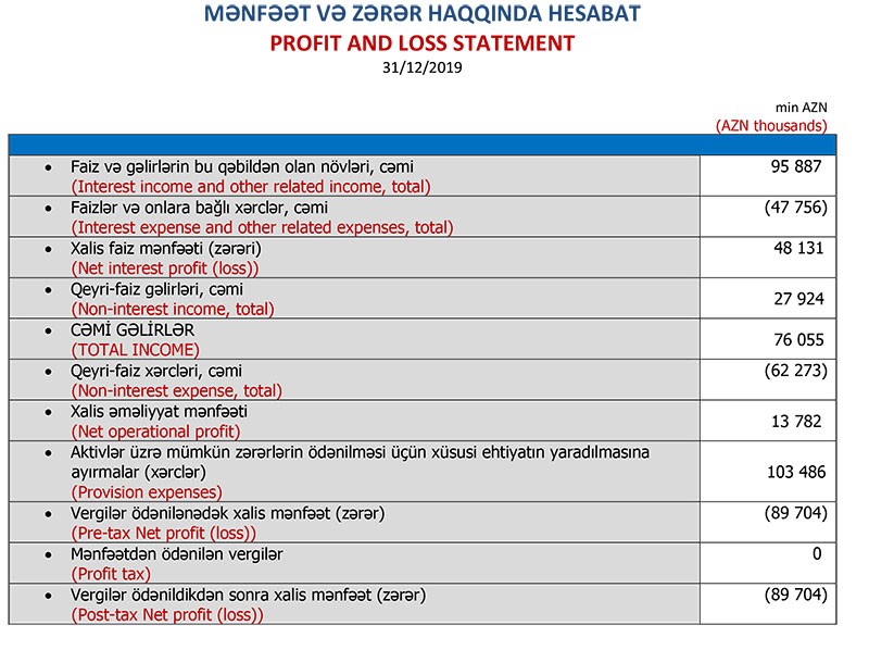 2018-ci ildə faiz gəlirləri 88 milyon 71 min manat ikən 2019-cu ildə 95 milyon 887 min manat təşkil edib. 2018-ci ildə qeyri-faiz gəlirləri üzrə 8 milyon 974 min manat zərər yarandığı halda 2019-cu ildə 27 milyon 924 min manat gəlir əldə edilib.