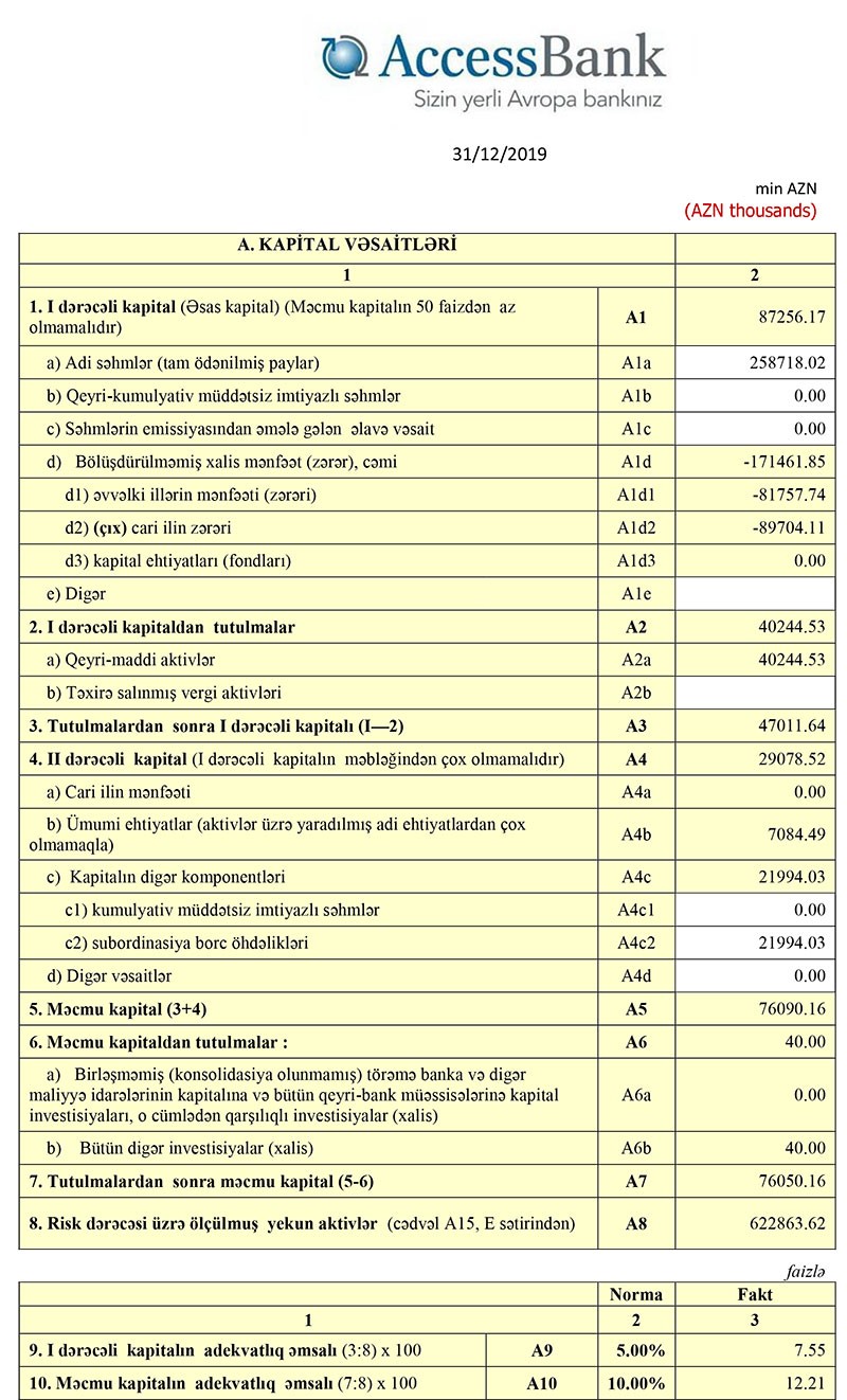 2019-cu ilin sonunda “AccessBank” 76 milyon 90 min məcmu kapitala malik olub.