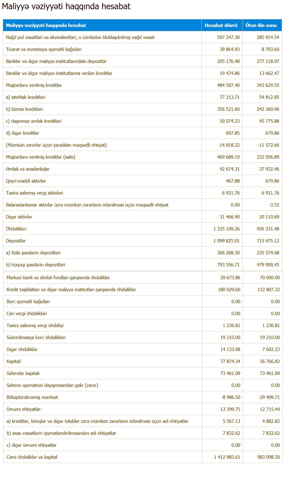 Bankın cəmi aktivlərinin 33%-ni və ya 484 milyon 507 min manatını müştərilərə verilmiş kreditlər təşkil edib. Bankda xalis kreditlər isə 469 milyon 689 min manat təşkil edib.