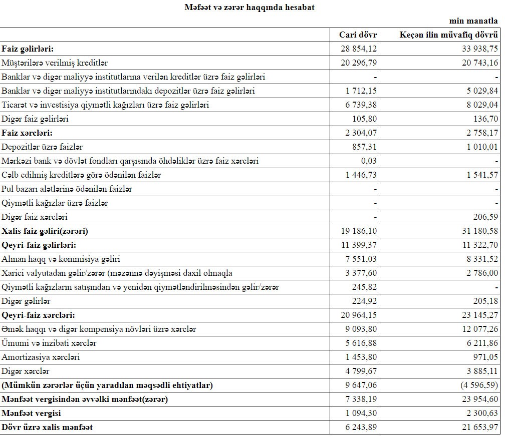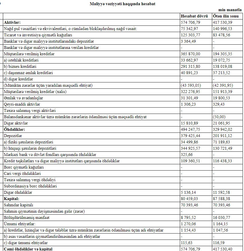 O cümlədən ötən il müştərilərə verilmiş kreditlər 171 milyon 565 min manat və ya 88% artaraq 365 milyon 870 min manata yüksəlib. 2018-ci ilin sonunda müştərilərə verilmiş kreditlər 194 milyon 305 min manat təşkil etmişdi.