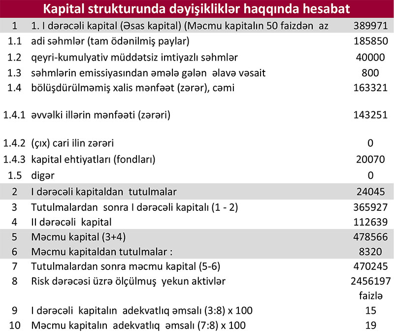 Müqayisə üçün qeyd edək ki, 2019-cu ilin ilk rübündə Kapital Bankın cəmi gələriləri 129 milyon 334 min manat, cəmi xərcləri 62 milyon 768 min manat, gəlirlər xərcləri üstələdiyindən əməliyyat mənfəəti 66 milyon 566 manat təşkil etmişdi. Bank əməliyyat mənfəətindən 6 milyon 505 min manat məqsədli ehtiyatlara ayırmış və 12 milyon 435 min manat mənfəət vergisi ödəmişdi.