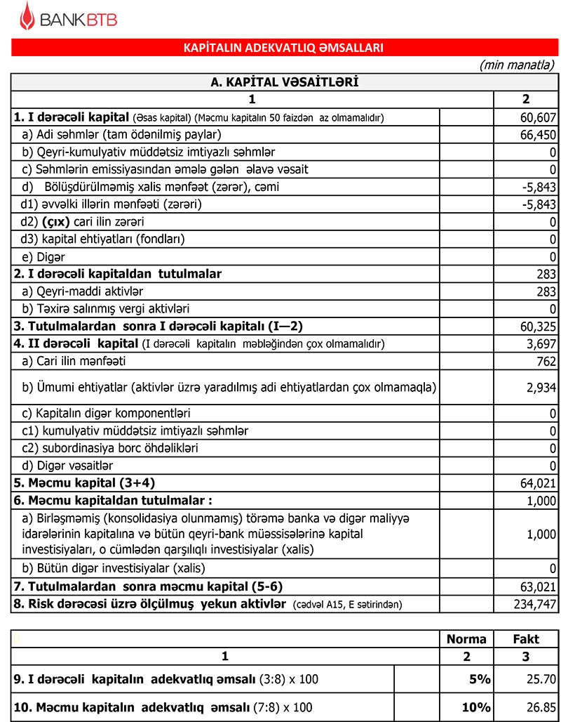 Rüb ərzində Bank BTB-nin I dərəcəli kapitalının adekvatlıq əmsalı 25.7%, məcmu kapitalının adekvatlıq əmsalı 26.85% təşkil edib. Beləliklə, Bankın kapital adekvatlığı göstəriciləri tənzimləyici orqanın müəyyən etdiyi normalardan dəfələrlə yüksək olub.