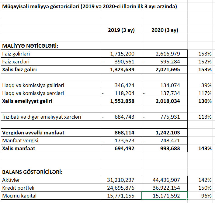Təşkilatın kredit portfeli, gəlirləri və xalis mənfəəti kəskin artıbBank Olmayan Kredit Təşkilatı “Embafinans” QSC 2020-ci ilin ilk rübünü 994 min manat xalis mənfəət ilə başa vurub. 2019-cu ilin ilk rübü ilə müqayisədə “Embafinans”ın xalis mənfəəti 43% artıb. Belə ki, təşkilat ötən ilin ilk rübündə 694 min manat xalis mənfəət ilə bağlamışdı.