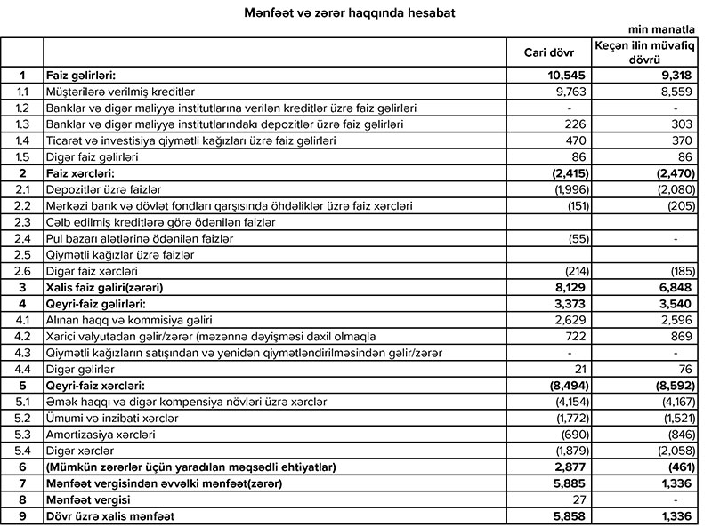 Bankın faiz gəlirləri ötən ilin ilk rübündə 9 milyon 318 min manat ikən, 2020-ci ilin ilk rübündə 10 milyon 545 min manat təşkil edib. Qeyri - faiz gəlirləri isə cüzi azalaraq 3 milyon 540 min manatdan 3 milyon 373 min manata düşüb.