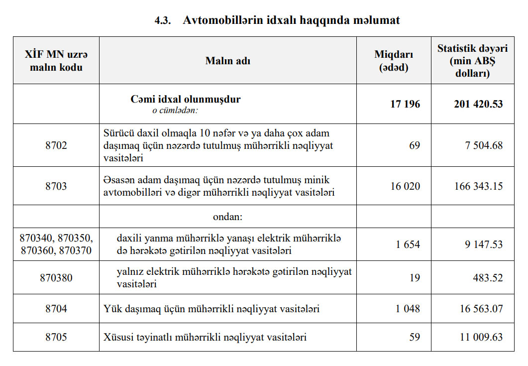 İlk 4 ayda ölkəmizə 16 min 20 ədəd minik avtomobili, 69 ədəd avtobus, 1 048 ədəd yük avtomobili və 59 ədəd xüsusi təyinatlı avtomobil idxal edilib.