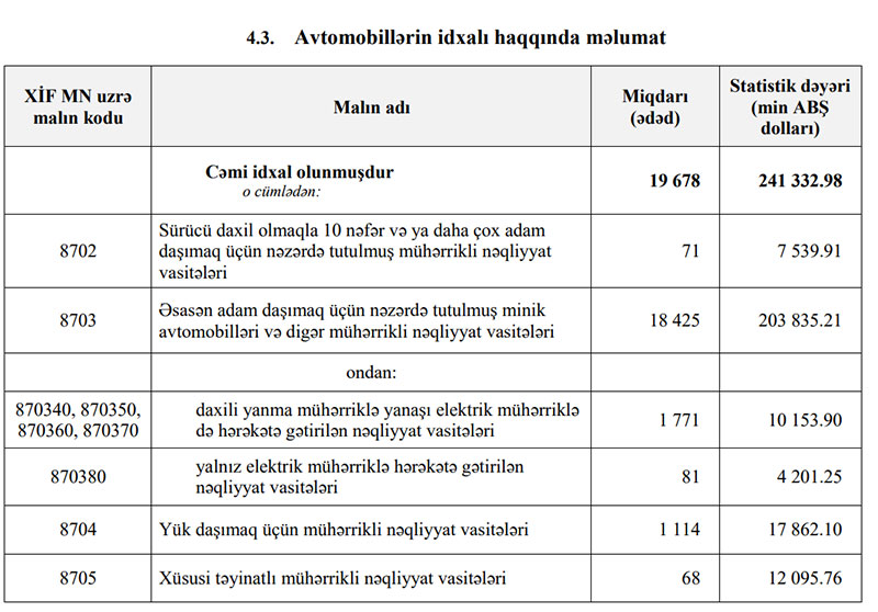İlk 5 ayda ölkəmizə 18 min 425 ədəd minik avtomobili, 71 ədəd avtobus, 1 771 ədəd yük avtomobili və 68 ədəd xüsusi təyinatlı avtomobil idxal edilib.