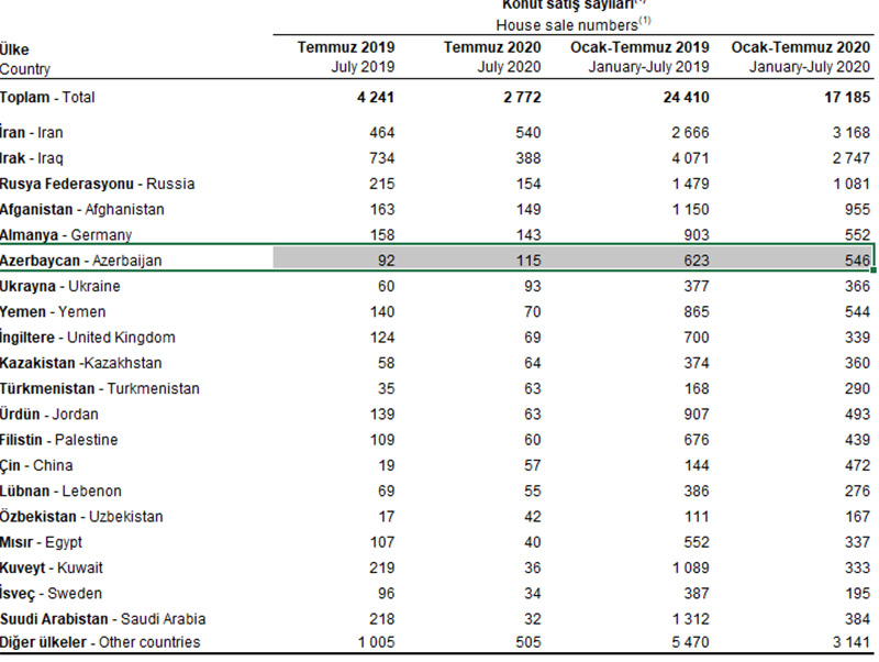 2020-ci ilin yanar-iyul aylarında azərbaycanlılar Türkiyədə 546 mənzil alıblar. 2019-cu ilin 7 ayında bu say 623 mənzil idi.