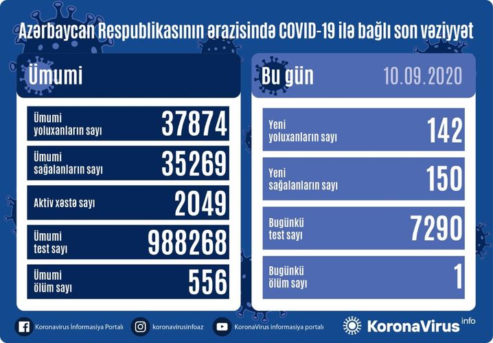 Onlardan 35269 nəfər müalicə olunaraq sağalıb, 556 nəfər vəfat edib, aktiv xəstə sayı 2049 nəfərdir.