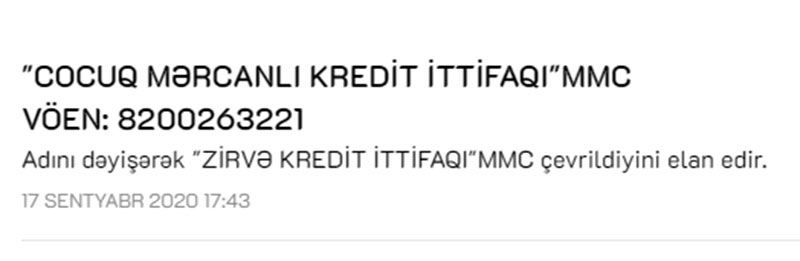 2018-ci ilin yanvar ayında yaradılmış və Azərbaycan Mərkəzi Bankından hələ lisenziya almamış "Cocuq Mərcanlı Kredit İttifaqı" MMC adını "Zirvə Kredit İttifaqı"na dəyişdiyini elan edib.