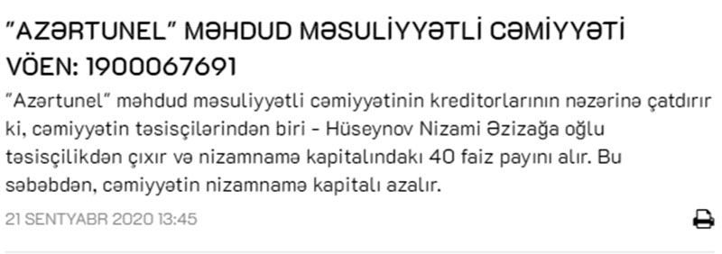Qeyd edək ki, hazırda "Azərtunel" MMC 29 milyon 984 min 310 manat nizamanmə kapitalına malikdir. Nizami Hüseynov payını aldıqdan sonra şirkətin nizamnamə kapitalı 17 milyon 990 min 586 manata geriləyəcəkdir.