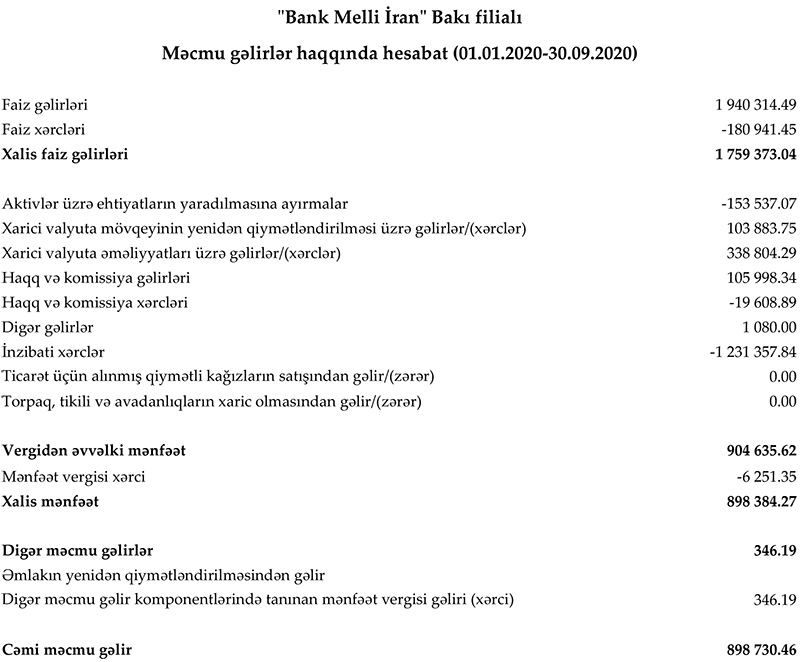 "Bank Melli İran" Bakı filialı 2020-ci ilin 9 ayını 898 min 384 manat xalis mənfəət ilə başa vurub. Halbuki, filial ötən ilin eyni dövründə 19 milyon 315 min 42 manat zərərə düşmüşdü. Ötən il zərər aktivlər üzrə ehtiyatların yaradılmasına 21 milyon 5 min manat ayrılması ilə əlaqədar idi. Ehtiyatın yaradılması filialın xeyli məbləğdə depozit və kreditinin itəcəyi ehtimalının güclənməsi ilə bağlı idi.