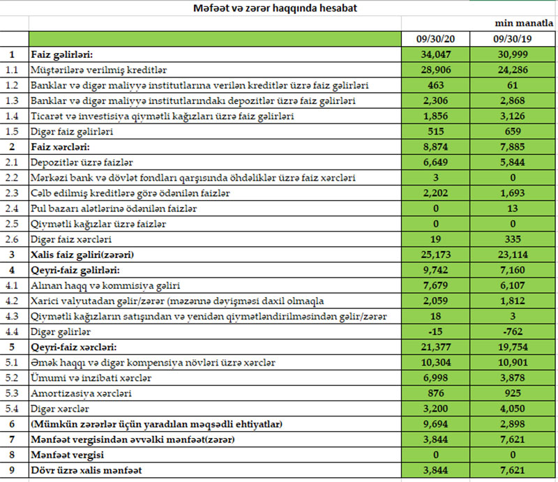 Müqayisə üçün qeyd edək ki, 2019-cu ilin 9 ayında Rabiətbankın cəmi əməliyyat gəlirləri 38 milyon 159 min manat, cəmi əməliyyat xərcləri 27 milyon 639 min manat, əməliyyat mənfəəti 10 milyon 520 min manat təşkil etmişdi. Bank əməliyyat mənfəətindən ehtiyatlara 2 milyon 898 min manat ayrılmışdı.