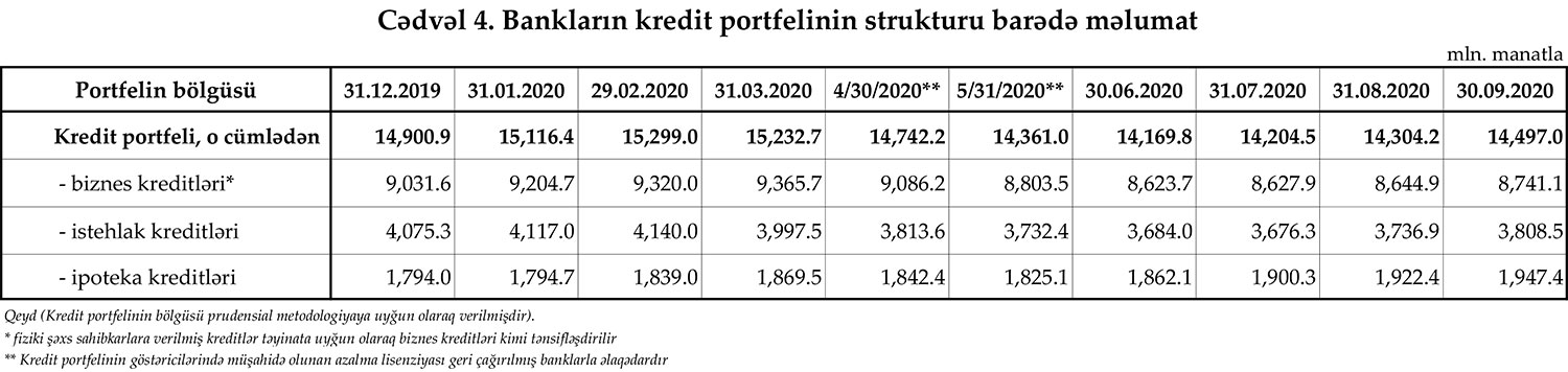 2020-ci ilin 3-cü rübündəki artıma baxmayaraq cəmi kreditlər 2019-cu ilin sonu ilə müqayisədə 403,9 milyon manat azdır. 2019-cu ilin sonunda bank sektorunun cəmi kredit portfeli 14 milyard 900 milyon 900 min manat təşkil etmişdi.