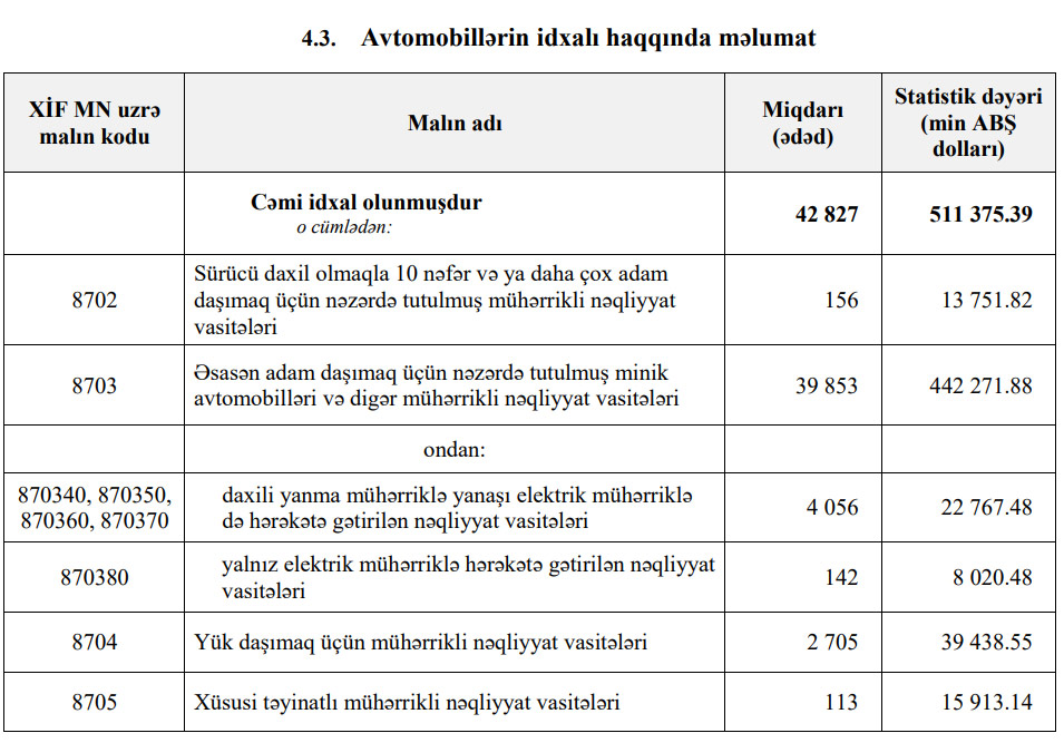 2020-ci ilin yanvar-oktyabr dövründə Azərbaycana 511 milyon 375 min dollar dəyərində 42 min 827 ədəd nəqliyyat vasitələri (avtomobil) idxal edilib.