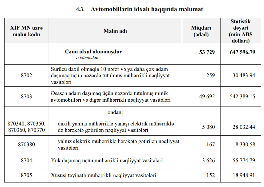 Ötən il ölkəmizə 49 min 692 ədəd minik avtomobili, 259 ədəd avtobus, 3 min 626 ədəd yük avtomobili və 152 ədəd xüsusi təyinatlı avtomobil idxal edilib.