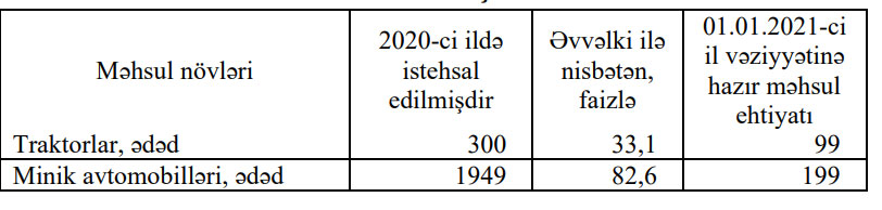Ötən il Azərbaycanda traktor istehsalı isə 66.9% azalaraq 300 ədəd təşkil edib. Traktorlar üzrə 01.01.2021-ci il tarixinə hazır məhsul ehtiyatı 99 ədəd təşkil edib.
