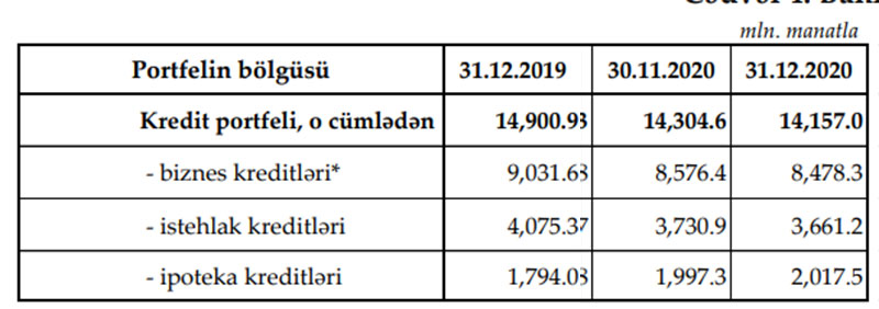 2020-ci il ərzində biznes kreditləri 553.3 milyon manat, istehlak kreditləri 414.1 milyon manat azalıb, ipoteka kreditləri isə 223.5 milyon manata artıb.