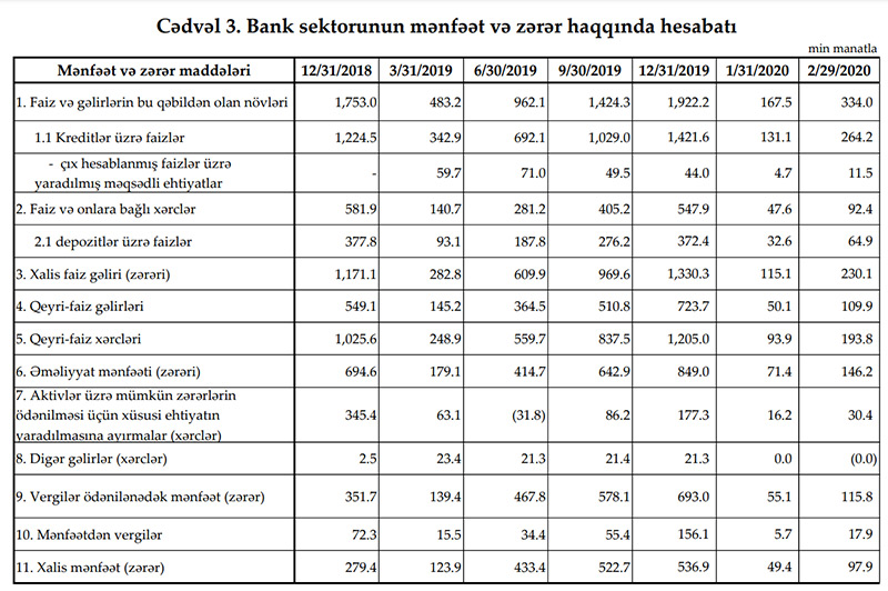 Azərbaycanın bank sektoru 2020-ci ilin yanvar-fevral dövrünü 97,9 milyon manat xalis mənfəət ilə başa vurmuşdu. Beləliklə, ötən ilin eyni dövrü ilə müqayisədə bank sektorunun xalis mənfəəti 25,3% azalıb.