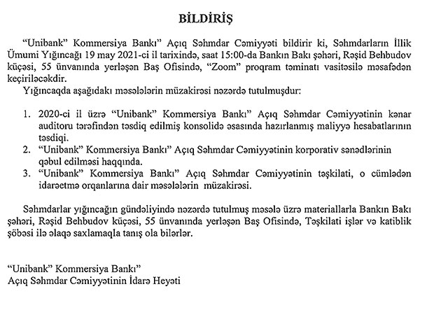 Mayın 19-da, saat 15:00-da “Unibank” ASC-nin səhmdarlarının illik ümumi yığıncağı keçiriləcək.
