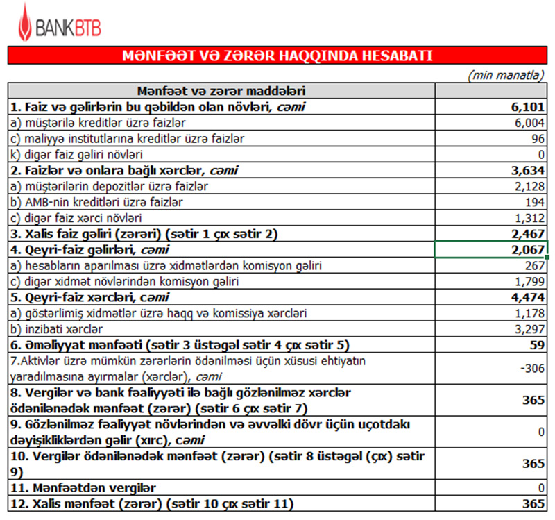 Müqayisə üçün qeyd edək ki, 2020-ci ilin 1-ci rübündə Bank “BTB”nin cəmi əməliyyat gəlirləri 7 milyon 984 min manat, cəmi əməliyyat xərcləri 7 milyon 56 min manat, əməliyyat mənfəəti 928 min manat təşkil etmişdi. Bank əməliyyat mənfəətindən 166 min manat aktivlər üzrə mümkün zərərlərin ödənilməsi üçün yaradılan xüsusi ehtiyata ayırmış və həmin dövrü 762 min manat xalis mənfəət ilə bağlamışdı.