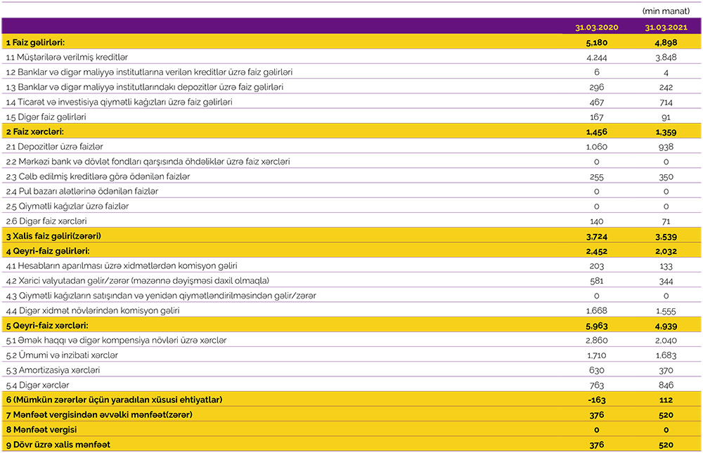 Marja Bankın maliyyə hesabatlarına istinadən xəbər verir ki, 2020-ci ilin 1-ci rübü ilə müqayisədə 2021-ci ilin 1-ci rübündə “Azər-Türk Bank”ın faiz gəlirləri 5,4% və ya 282 min manat azalaraq 4 milyon 898 min manat, qeyri-faiz gəlirləri isə 17,1% və ya 420 min manat azalaraq 2 milyon 32 min manat təşkil edib.