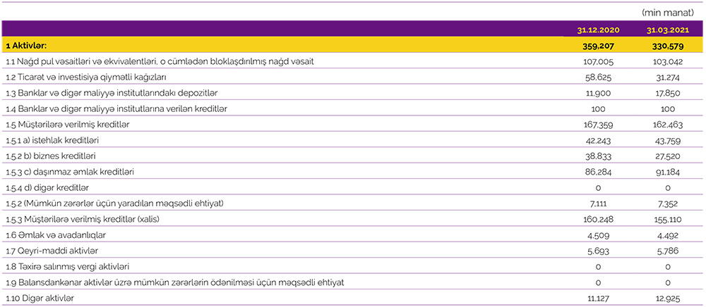 31 Mart 2021-ci il tarixində "Azər-Türk Bank" 330 milyon 579 min manat cəmi aktivlərə, o cümlədən 162 milyon 463 min manat kredit portfelinə (müştərilərə verilmiş kreditlər) malik olub. Bank ötən ilin sonunda 359 milyon 207 min manat cami aktivlərə, o cümlədən 167, milyon 359 min manat kredit portfelinə malik idi.