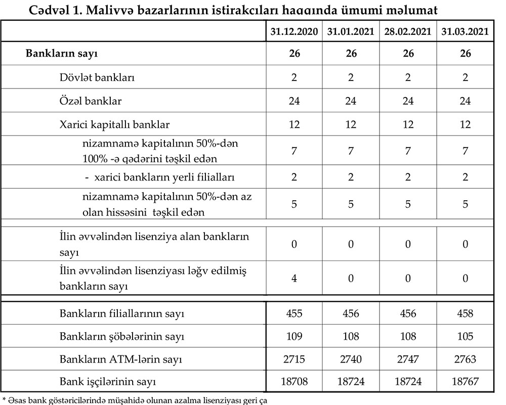 31 mart 2021-ci il tarixinə olan bank sektorunun əsas göstəriciləri açıqlanıb.