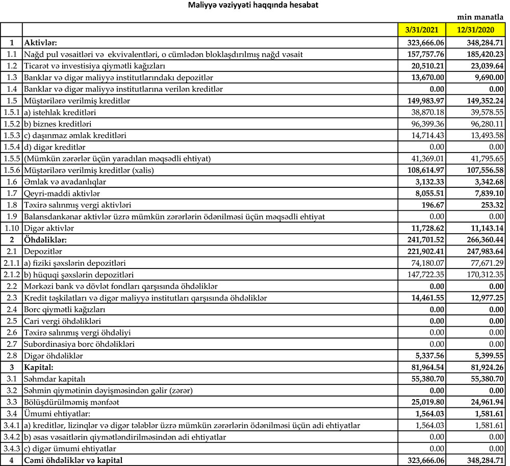 Müqayisə üçün qeyd edək ki, 2020-ci ilin ilk rübündə “Yapı Kredi Bank Azərbaycan”ın cəmi əməliyyat gəlirləri 10 milyon 693 min manat, cəmi əməliyyat xərcləri 7 milyon 50 min manat, əməliyyat mənfəəti 3 milyon 643 min manat, mümkün zərərlər üçün yaradılan ehtiyatlara ayırdığı məbləğ 4 milyon 53 min manat, ödənilmiş mənfəət vergisi 247 min manat, əməliyyat zərəri 656 min manat təşkil etmişdi.