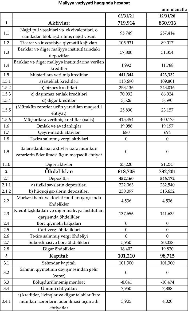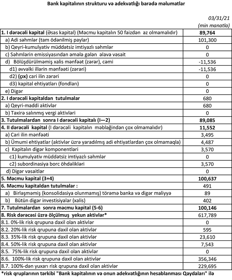 31 Mart 2021-ci il tarixində “Rabitəbank” 100 milyon 146 min manat məcmu kapitala malik olub.