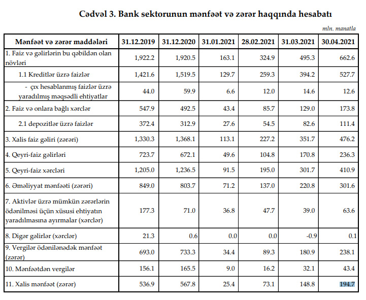 Marja Mərkəzi Banka istinadən 30 aprel 2021-ci il tarixinə olan bank sektorunun əsas göstəricilərini təqdim edir.