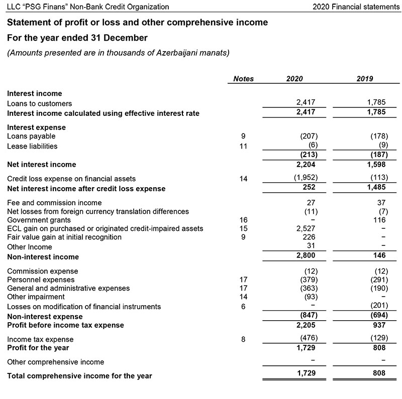 “PSG Finans” BOKT MMC 2020-ci ili 1 milyon 729 min manat xalis mənfəət ilə başa burub, bu, 2019-cu illə müqayisədə 2,1 dəfə çoxdur. Təşkilat 2019-cu ili 808 min manat xalis mənfəət ilə bağlamışdı.