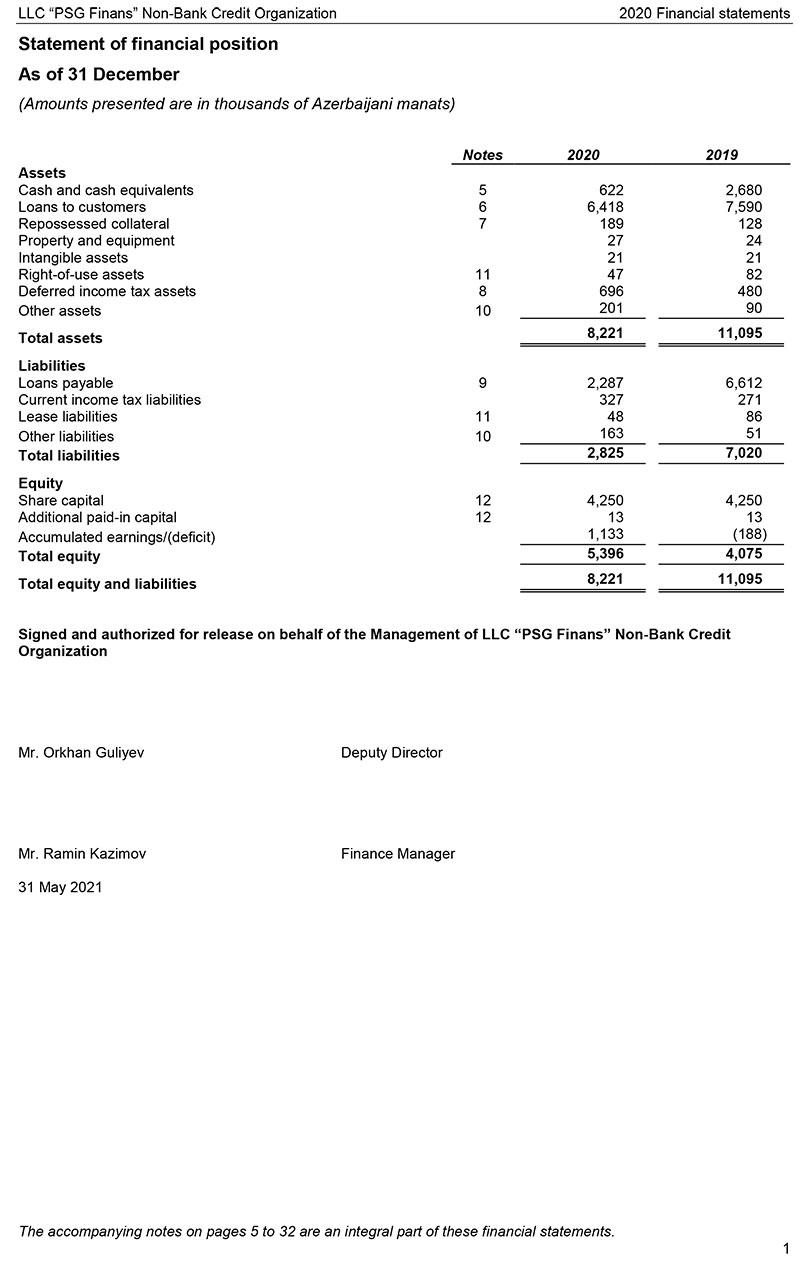 31 Dekabr 2020-ci il tarixində “PSG Finans” BOKT 8 milyon 221 min manat cəmi aktivlərə malik olub, o cümlədən aktivlərin 6 milyon 418 min manatını müştərilərə verilmiş kreditlər təşkil edib. 2019-cu ilin sonunda PSG Finans” 11 milyon 95 min manat cəmi aktivlərə və 7 milyon 590 min manat kredit portfelinə malik idi.