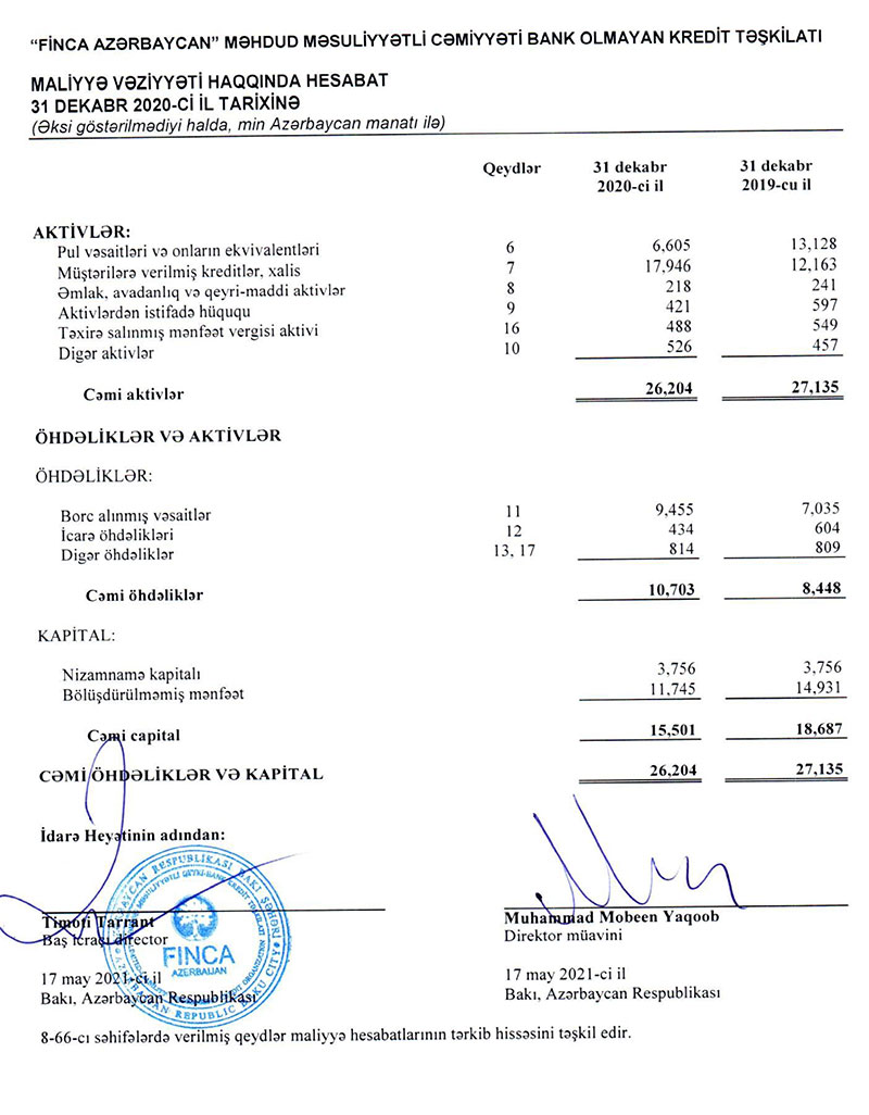 Hesabat dövründə “FINCA Azerbaijan”ın öhdəlikləri 26,7% artaraq 10 milyon 703 min manata çatıb, balans kapitalı isə 17% azalaraq 15 milyon 501 min manata düşüb.