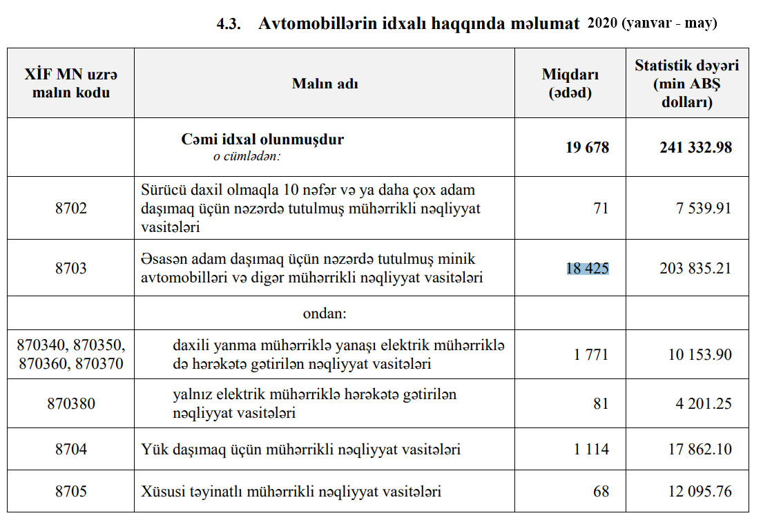 Qeyd edək ki, 2020-ci ilin yanvar-may aylarında Azərbaycana 241 miylon 333 min dollar dəyərində 19 min 678 ədəd avtomobil idxal edilmişdi.