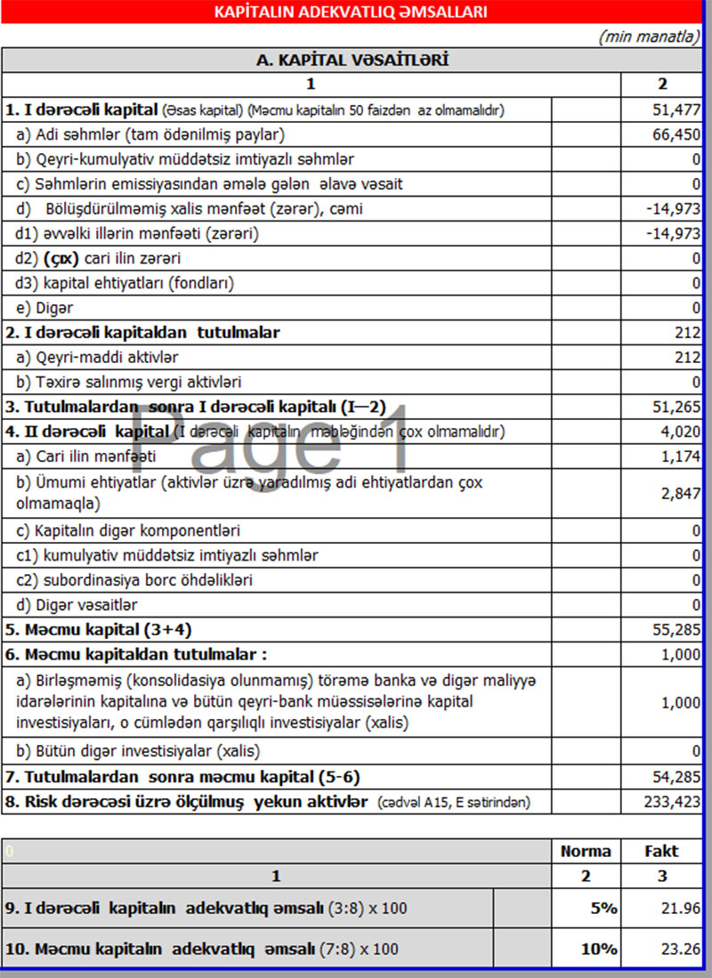 Həmçinin, cari ilin 9 ayı ərzində bankın faiz gəlirləri 18 milyon 870 min manat, faiz xərcləri isə 11 milyon 500 min manat olmuşdur. Qeyd edilən dövrdə qeyri-faiz gəlirləri 3 milyon 525 min manat, qeyri-faiz xərcləri isə 10 milyon 832 min manat təşkil etmişdir.