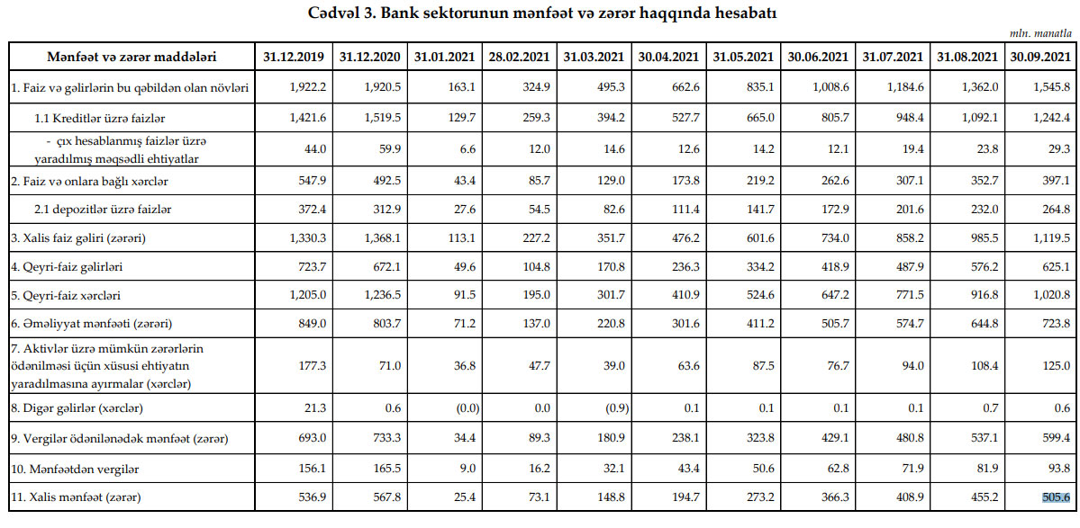 Azərbaycanın bank sektoru 2021-ci ilin 9 ayını (yanvar-sentyabr dövrünü) 505,6 milyon manat xalis mənfəət ilə başa vurub.