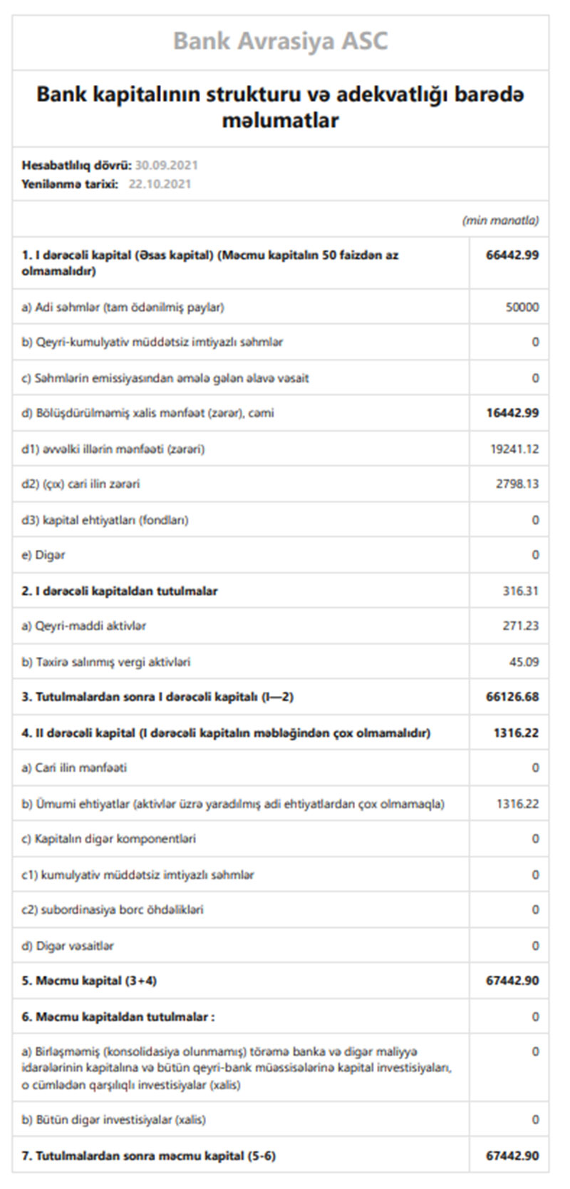 30 Sentyabr 2021-ci il tarixində“Bank Avrasiya” 67 milyon 4423 min manat məcmu kapitala malik olub.