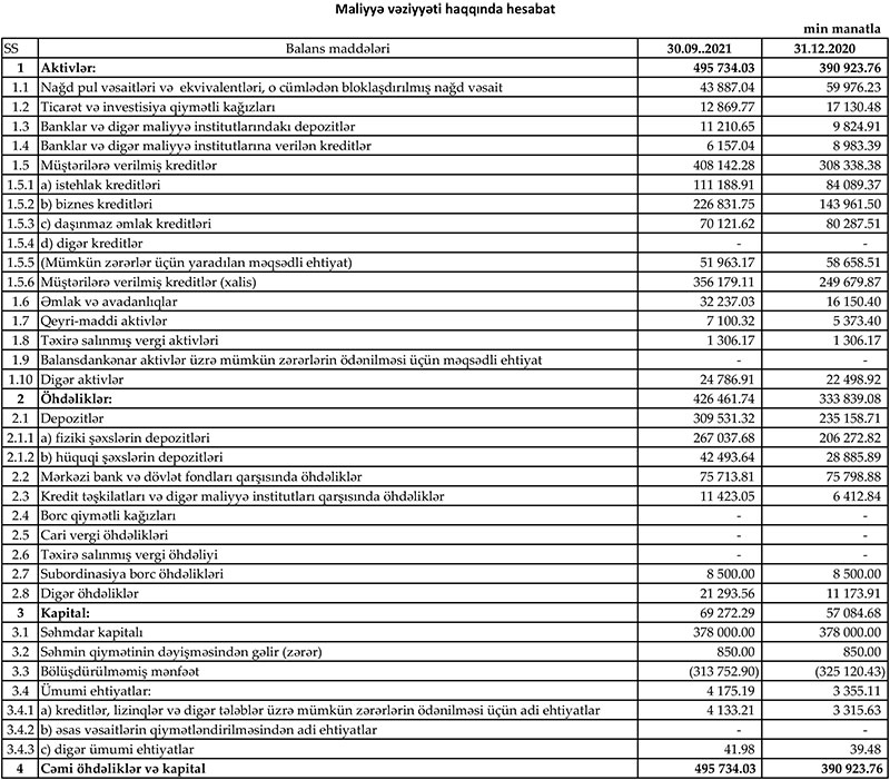 Bankın yaydığı press-relizdə bildirilir ki, ilin əvvəlindən Bankın xalis mənffəti 11,4 milyon manata çatıb. Eyni zamanda, Bankın aktivləri də 105 milyon manat artaraq 495.7 milyon manat təşkil edib.