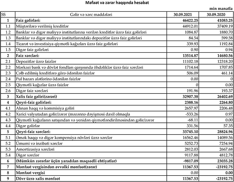 Hesabat dövrü üzrə bankın xalis faiz gəlirləri 32.9 milyon manat təşkil edib. Hazırda Bankın məcmu kapitalı 64.3 mln manatdır, bu göstərici requlyativ tələbdən 14.3 mln manat çoxdur.