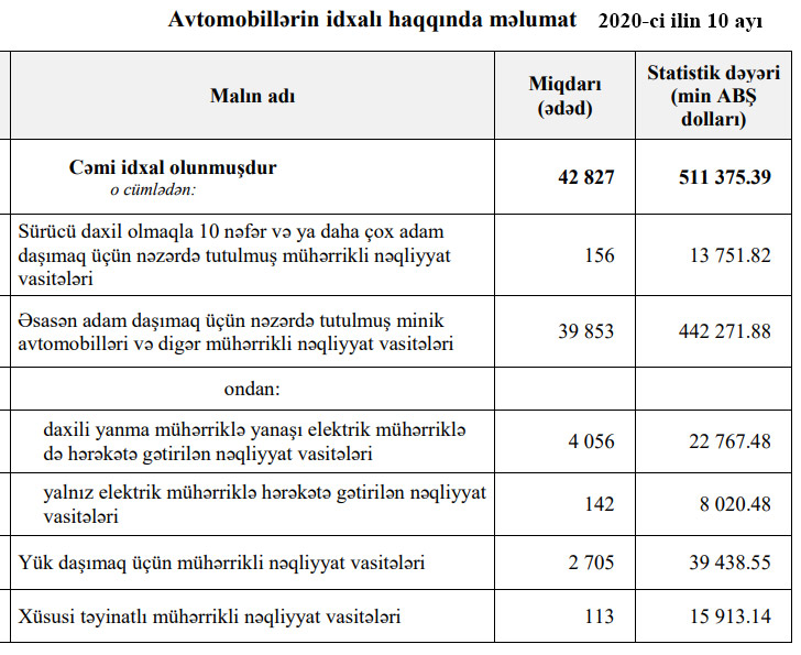 Qeyd edək ki, 2020-ci ilin yanvar-oktyabr aylarında Azərbaycana 511 milyon 375 min dollar dəyərində 42 min 827 ədəd avtomobil idxal edilmişdi.