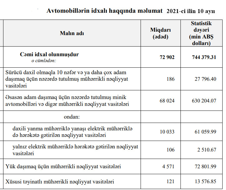 2021-ci ilin yanvar-oktyabr ayları ərzində (10 ayda) xarici ölkələrdən Azərbaycana 744 milyon 379 min dollar dəyərində 72 min 902 ədəd avtomobil (nəqliyyat vasitələri) idxal edilib.