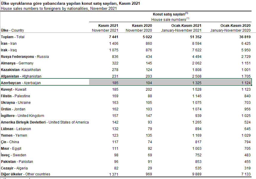 2021-ci ilin yanvar-noyabr aylarında (11 ay ərzində) azərbaycanlılar Türkiyədə 1325 mənzil alıblar. 2020-cu ilin eyni dövründə azərbaycanlılar Türkiyədə 1124 mənzil almışdılar. Təkcə Noyabrda azərbaycanlılar tərəfindən 185 mənzil alınıb. Oktyabrda azərbaycanlılar tərəfindən 120 mənzil alınmışdı.