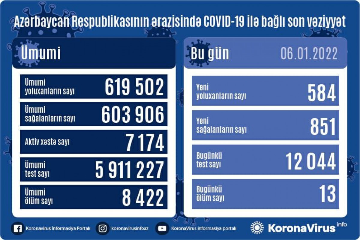 Xatırladaq ki, 05 Yanvar 2022-ci il tarixində 553 yoluxma faktı və 11 ölüm qeydə alındığı açıqlanmışdı. 13 Dekabr 2020-ci il tarixində açıqlanmış fakt (4451) bugünədək qeydə alınmış ən yüksək günlük yoluxma sayı idi.