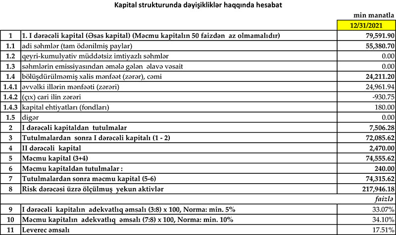 31 Dekabr 2021-ci il tarixində “Yapı Kredi Bank Azərbaycan” 74 milyon 316 min manat məcmu kapitala malik olub. Bu da, Mərkəzi Bankın 50 milyon manat olan məcmu kapital tələbindən yüksəkdir.