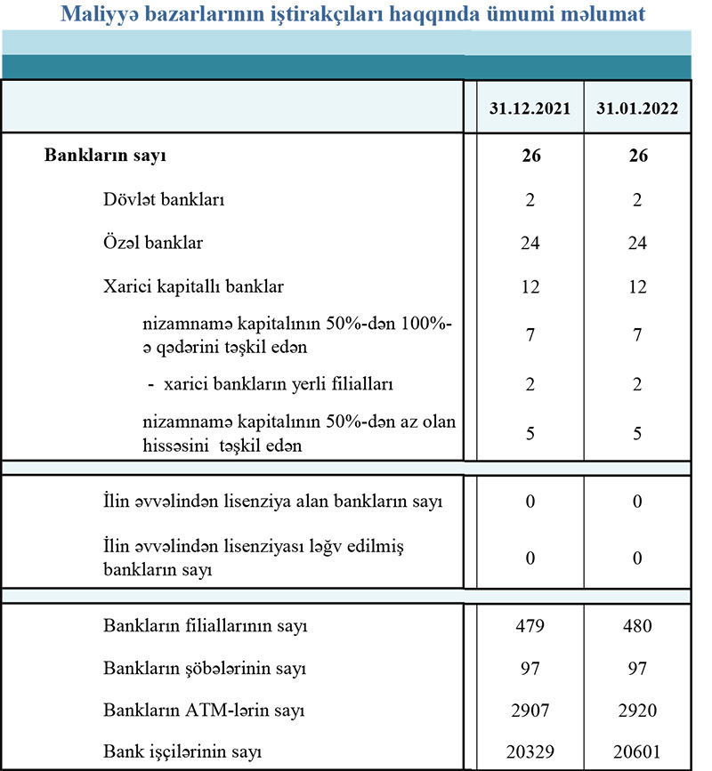 31 yanvar 2022-ci il tarixinə olan bank sektorunun əsas göstəriciləri açıqlanıb.