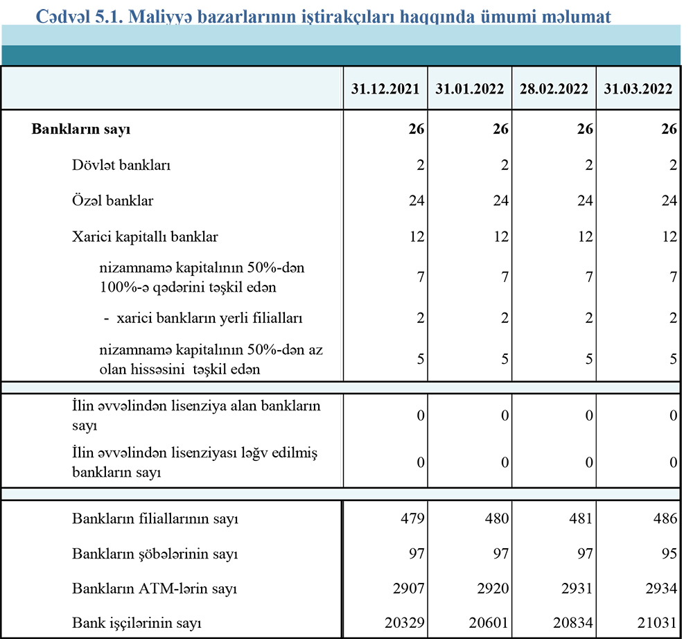 Azərbaycanın bank işçilərinin sayı 21 min nəfər həddini də aşaraq 31 Mart 2022-ci il tarixində 21 min 31 nəfər təşkil edib.