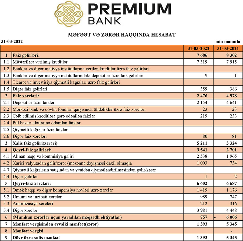 "Premium Bank" ASC 2022-ci ilin 1-ci rübünü 1 milyon 393 min manat xalis mənfəət ilə başa vurub. Halbuki, Bank 2021-ci ilin eyni dövrünü 5 milyon 345 min manat xalis mənfəət ilə bağlamışdı. Beləliklə, "Premium Bank"ın xalis mənfəəti 2021-ci ilin ilk rübü ilə müqayisədə 2022-ci ilin ilk rübündə 3,8 dəfə azalıb. 2021-ci ilin ilk rübündə Bankın xalis mənfəəti mümkün zərərlər üçün yaradılan məqsədli ehtiyatlardan azad olmuş 6 milyon 6 min manatın hesabına formalaşmışdı.