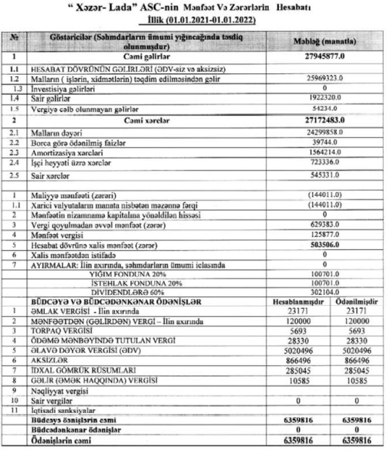 Rusiyanın "AvtoVaz" şirkətinin Azərbaycanda rəsmi tərəfdaşı "Xəzər Lada" ASC 2021-ci ili 504 min manat xalis mənfəət ilə başa vurub. Halbuki, Şirkət 2020-ci ili 389 min manat xalis mənfəət ilə bağlamışdı.