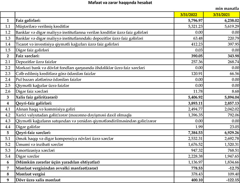 “Yapı Kredi Bank Azərbaycan” ilk rübü mənfəətlə tamamlayıb - MALİYYƏ GÖSTƏRİCİLƏRİ