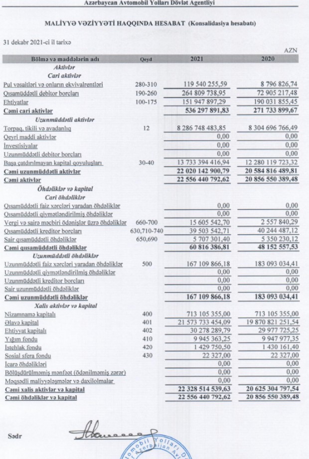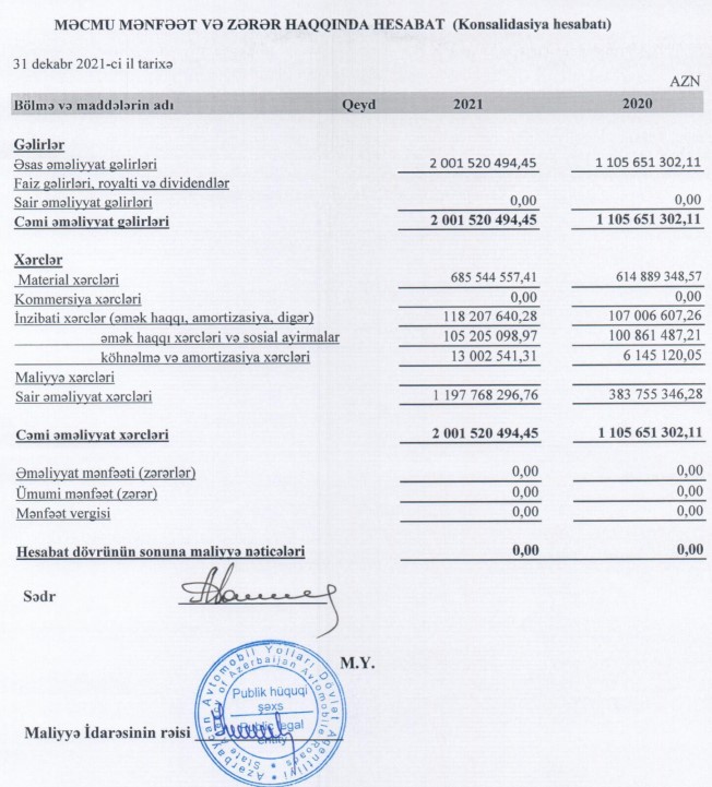 2021-ci ildə Azərbaycan Avtomobil Yolları Dövlət Agentliyinin (AAYDA) cəmi gəlirləri 2 milyard 1 milyon 520 min manat və cəmi xərcləri də 2 milyard 1 milyon 520 min manat təşkil edib.